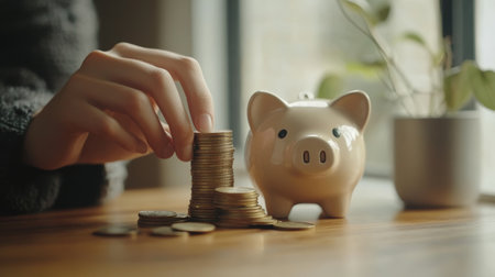 Hand stacking coins on wooden table next to piggy bank, symbolizing saving money, financial planning, and investment for future goals