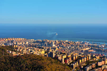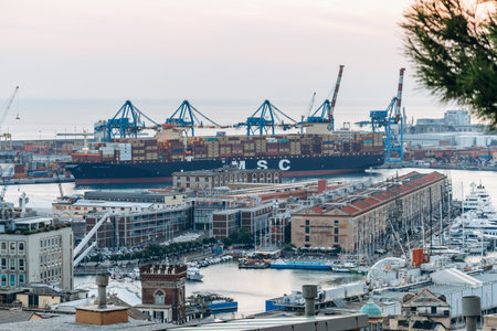 Aerial view of seaport and cityscape of Genoa in the evening, Italy