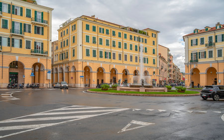 Finale Ligure (SV), ITALY - August 24, 2017: Piazza Vittorio Emanuele II in Finale Ligure ITALY. On the square there are several palaces with seventeenth-century facades and the imposing arch dedicated to Margherita Teresa of Spain. The square is also the