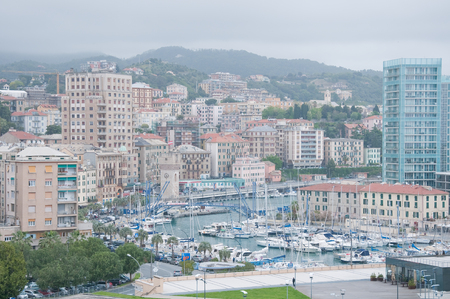 Savona, Italy - December 2, 2016: Cityscape with the marina and Brandale tower viewed from the Priamar fortress in Savona, Liguria, Italy.