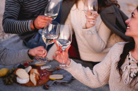 From above cheerful adult women and men in casual clothes toasting with wineglasses resting together on plaid on shore and having picnic in autumn