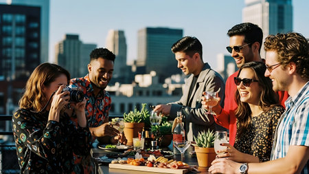 A group of friends enjoying a meal outdoors, laughing and sharing food, with plates of colorful dishes and drinks on the table