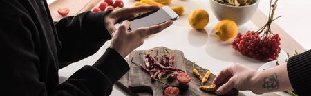 cropped view of two professional photographers making food composition for commercial photography on smartphone on wooden table