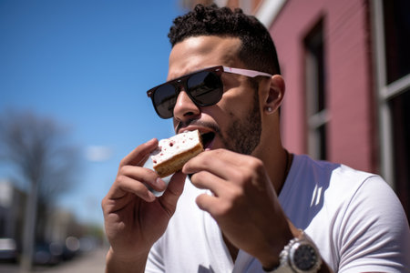 man with sunglasses takes a bite of an ice cream sandwich