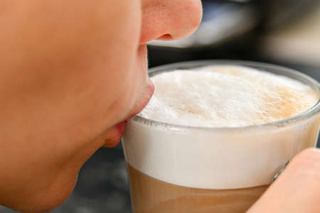 Coffee with foam in the hands of a girl who drinks foam with her lips. Girl drinks coffee close-up.
