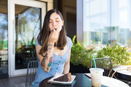 Hispanic satisfied woman enjoying pastry at cafe in shopping mall