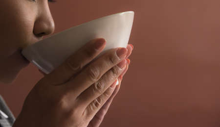 Young woman wearing casual clothing and drinking hot coffee. White background.