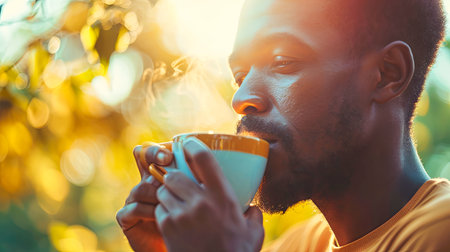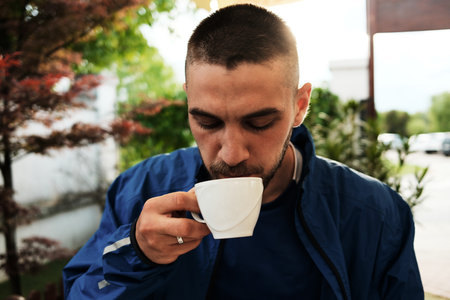 Young man in blue jacket enjoying a cup of coffee outdoors, surrounded by greenery and soft daylight. Good morning at outdoor cafe.
