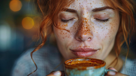 In a softly lit space, a young woman enjoys a quiet moment with a steaming cup of coffee, her relaxed expression reflecting the comfort of the cozy ambiance.