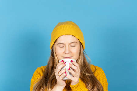 Young woman holding warm drink isolated on blue background. Teenager girl wearing yellow hat.
