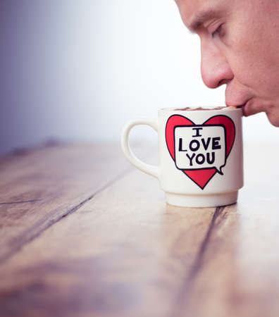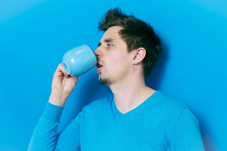 Alloa, Scotland - 17 July 2019: mad drinking coffee from mug
