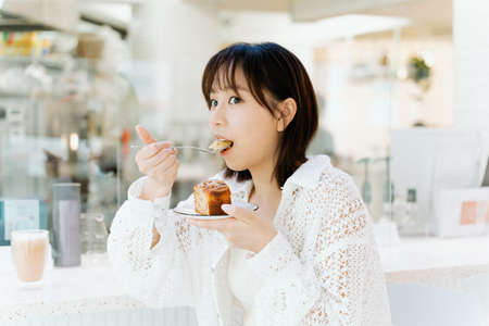 Asian young girl enjoying her cake in a cafe.