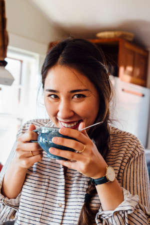 Close up portrait of Asian woman eating a chocolate bar while smiling as she enjoys her snack.