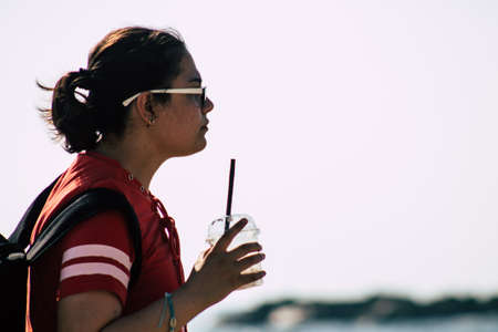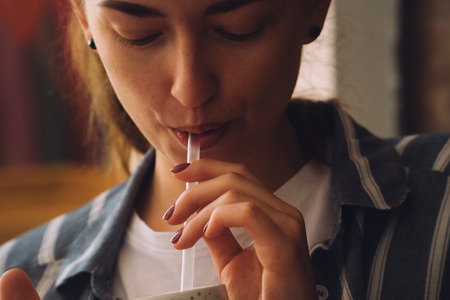 Girl drinking a beverage from a disposable Cup. Light toning.