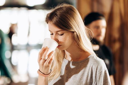 A good looking slim blonde girl,dressed in casual style,holds a cup of coffee and smells it in a cozy coffee shop.