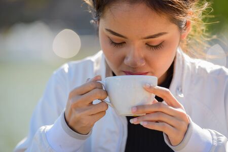 Arab Muslim women drinking coffee in the morning outdoor, Asian businesswoman young girl smiling hand hold coffee cup standing closeup.