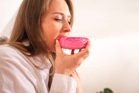 Eating doughnut for breakfast in the bed
