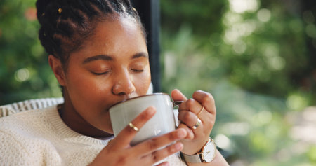 Coffee, relax and black woman in home with calm, peace or positive memory in morning. Cappuccino, happy and African female person with drinking latte and bokeh in living room for break