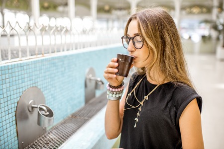 Woman in the old pump room with thermal water