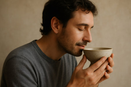 Caucasian man with closed eyes savoring the rich aroma of a warm beverage in a cozy ceramic bowl, embracing moments of tranquility and comfort