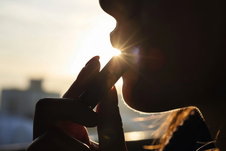 Silhouette of a person applying lip balm at sunset. Close-up with warm backlight and silhouette concept. Design for beauty, self-care, and wellness posters, banners, and articles.
