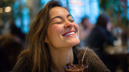 A woman laughs with joy as she tastes a decadent dessert in a cozy cafe. Her eyes are closed, and her head is slightly tilted back, capturing a moment of pure delight.