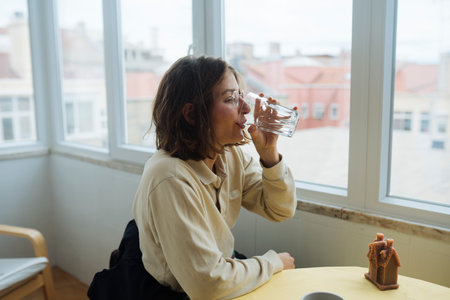 caucasian woman sipping water, freelance writer morning pause
