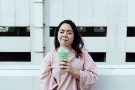 Long hair fat woman is over the moon with iced green tea in the city.