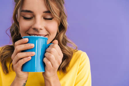 Happy beautiful nice girl smiling while drinking coffee isolated over purple background