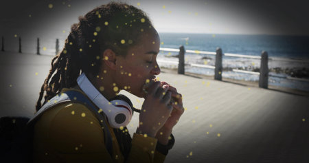 Eating woman in yellow jacket biting sandwich by seaside railing, with white headphones, copy space. Coastal, leisure, vibrant, youthful, outdoor, lifestyle, serenity