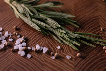 Sprigs of rosemary on a wooden board for cutting. Rustic style. Spice