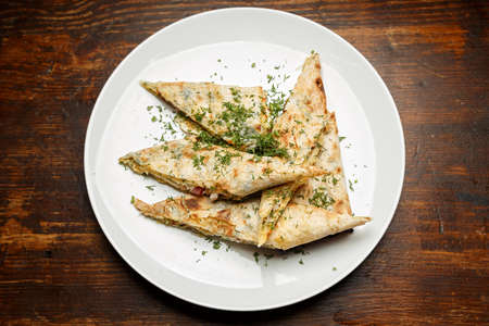 On a plate of pita bread with cheese, sprinkled with herbs. The plate stands on a wooden surface. Horizontal photo
