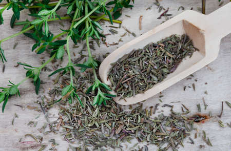 dried thyme herbs in wooden scoop on rustic surface
