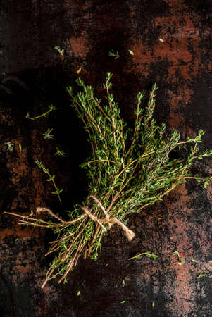 Bunch of fresh organic thyme on an old metallic rusty black background, copy space top view