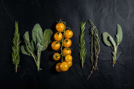tomato, sage, rosemary, thyme on black backgrounda close up