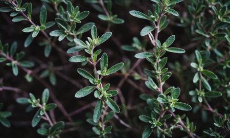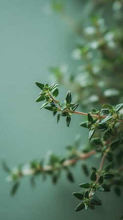 Detailed macro shot showcasing the texture and vibrant green leaves of a thyme herb plant. Soft background enhances the focus on the intricate details of the herb.