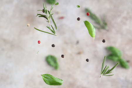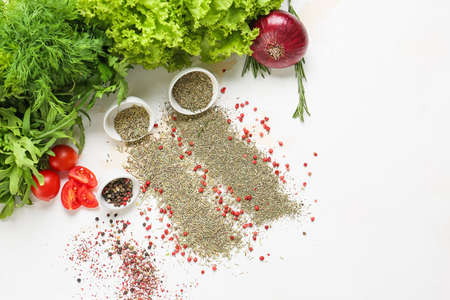 Fresh herbs with spices and tomatoes on light background