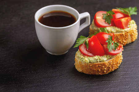 Bruschetta with chopped cherry tomatoes, puree avocado and cup of coffee on the black slate background.