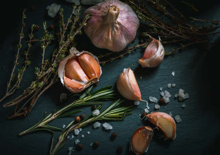 Garlic. Garlic on a black background. Nuts, cheese, rosemary and thyme. Ingredients for cooking delicious food with garlic