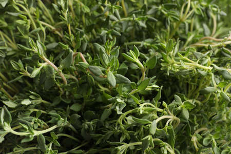 Aromatic thyme sprigs growing as background, closeup. Fresh herb