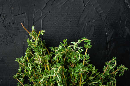 Thyme green fresh bunch, on black background, top view with copy space for text