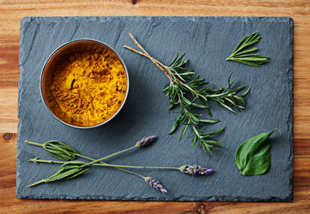 Fragrant ingredients. High angle shot of a bowl of turmeric with herbs beside it.