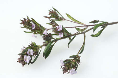 Savory, Satureja montana, is a herb and a medicinal and scented plant with white flowers. She is one year old.