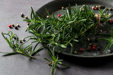 A bunch of fresh rosemary and pepper mix on an iron plate