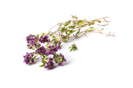 Sprigs of dried thyme close up isolated on white background