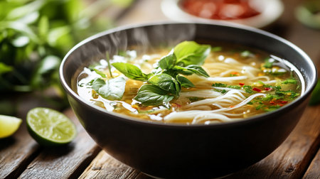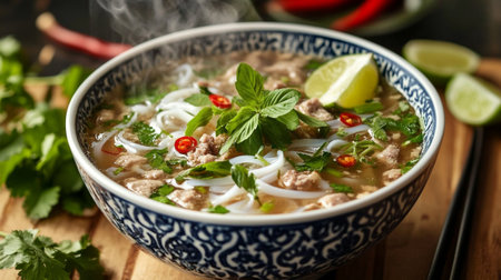 A close-up view of a delicious bowl of Asian noodle soup with a variety of garnishes, including lime, chili, star anise, and green onions. The soup is steaming and the noodles are perfectly cooked.