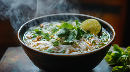 A close-up of a steaming bowl of pho, featuring tender beef, rice noodles, fresh herbs, and a flavorful broth.