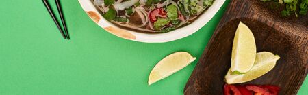 top view of pho in bowl near chopsticks and wooden board with lime on green background, panoramic shot