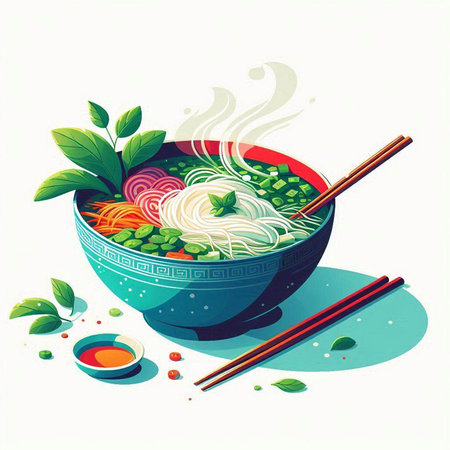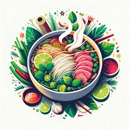 Illustration of a bowl of Asian soup with chopsticks and lime