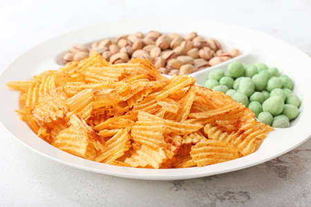 Plate with tasty potato chips, pistachios and peanuts on light background, closeup